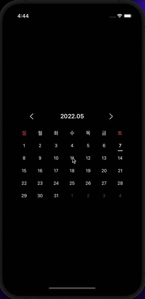 AnimatableSectionModelType를 채택해야 한다. isCurrentMonth는 cell의 날짜가 현재 달의 날짜인지, isSelected는 현재 날짜가 선택됐는지, isCurrentDay는 날짜가 오늘인지, day는 cell의 일을 저장하고, data는 현재 셀의 년, 월, 일 전체 날짜를 저장한다.