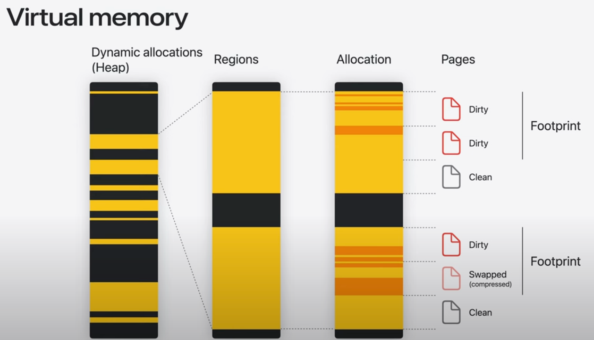 힙은 단지 하나의 메모리 블록이 아니라 여러 virtual memory 영역으로 구현된다. Regions을 좀 더 확대하면, 각 Region이 개발 힙 alloc으로 구분된다. 내부적으로 이 Region은 16KB 메모리 페이지로 구성되지만 각 alloc은 더 크거나 작을 수 있다. 이러한 page는 Clean, Dirty, Swapped 세 가지 상태 중 하나일 수 있다.