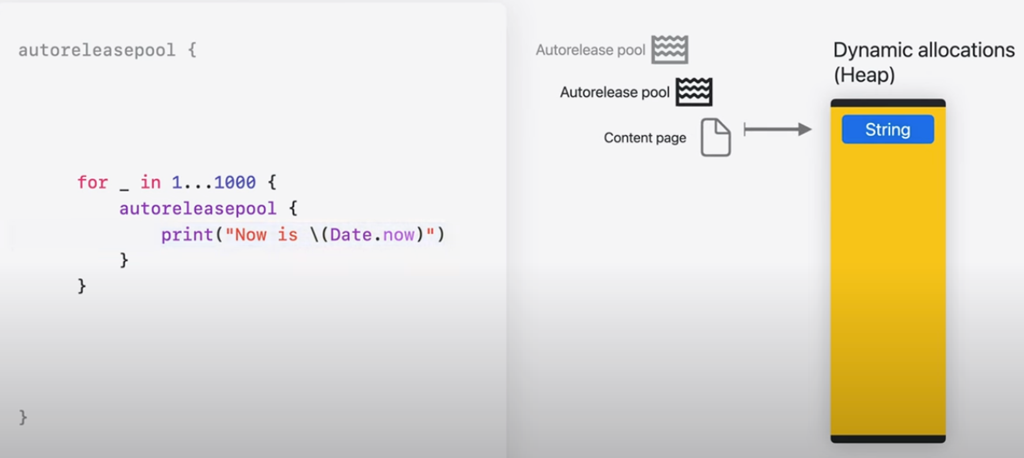 Autorelease Pools은 일시적인 메모리 증가의 일반적인 원인이다. objc 는 이러한 pool을 사용해서 함수의 반환 값에 대한 수명을 연장한다. Autorelease pools은 release를 나중까지 지연해서 return 값을 유지한다. 자동으로 메모리를 할당하는 Swift를 사용하고 있지만 Swift에서 objc api를 사용하거나 이를 포함하는 프레임워크를 호출할 때 autorelease된 객체를 생성할 수 있음을 의미한다.