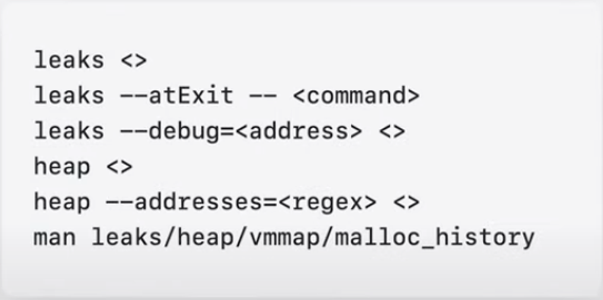 3. leaks, heap, vmmap, mallock_history 등과 같은 command line tool 명령어는 macOS 및 시뮬레이터 프로세스를 직접 분석하거나 이미 캡처된 메모리 그래프를 사용해서 문제를 조사할 수 있다.