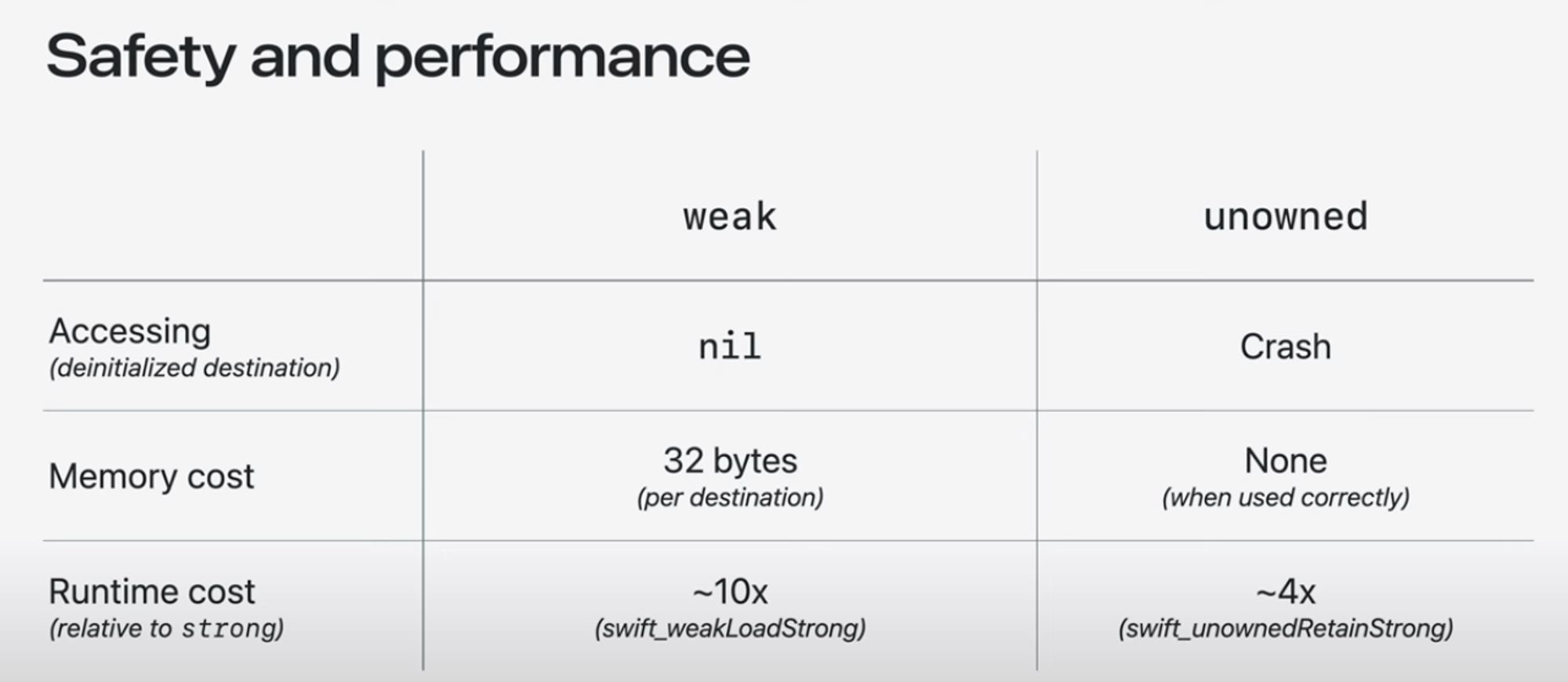 weak reference와 달리 unowned reference는 대상을 직접 보유한다. 이는 추가 메모리를 사용하지 않으며 weak reference보다 access하는데 시간이 덜 걸린다는 것을 의미한다. 하지만 참조된 객체가 더 일찍 해제되는 경우 crash가 결정적으로 발생하게 된다. 따라서 해당 객체가 얼마나 오래 지속될지 모른다면 weak reference의 작은 오버헤드는 가치가 있다.